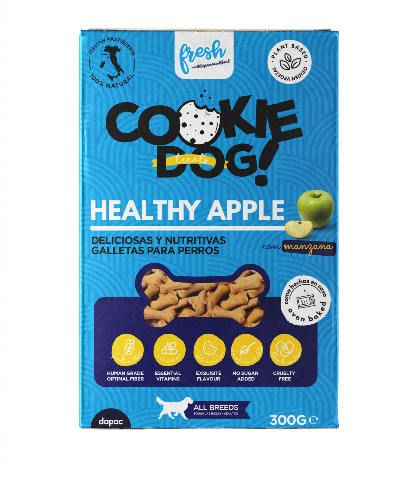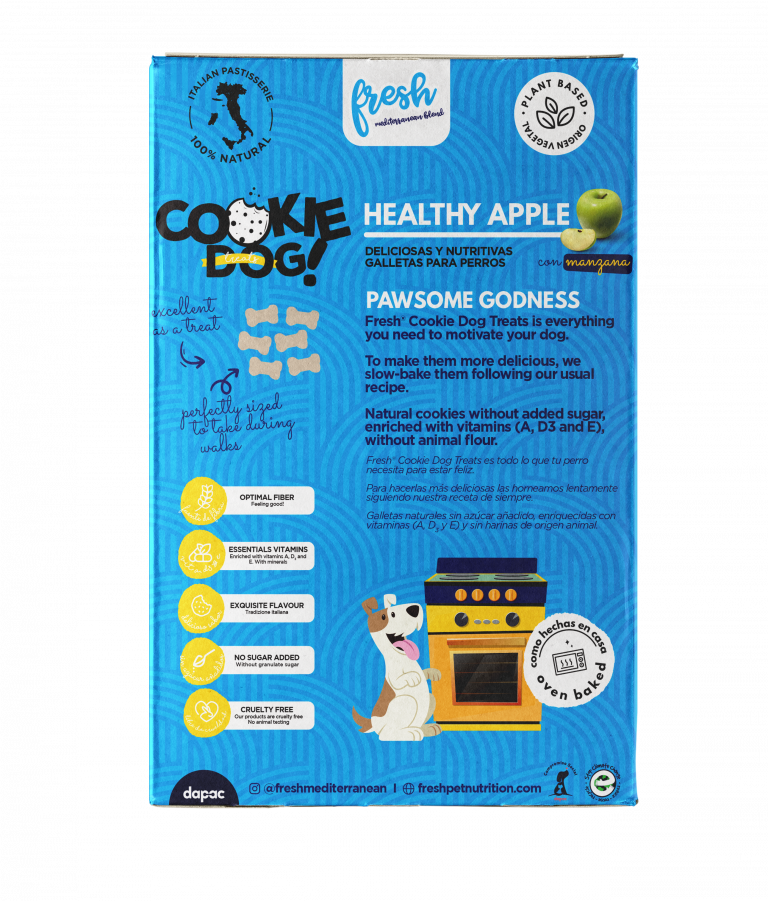 Las Fresh Cookie Dog Treats Healthy Apple son unas nutritivas y saludables galletas con manzana elaboradas con ingredientes naturales y de origen 100% vegetal. Su receta no contiene azúcares, tienen un sabor y aroma exquisito y son perfectas como premio o recompensa, o si quieres incorporarlas en la dieta mixta del perro (comida seca, comida húmeda, semihúmeda).