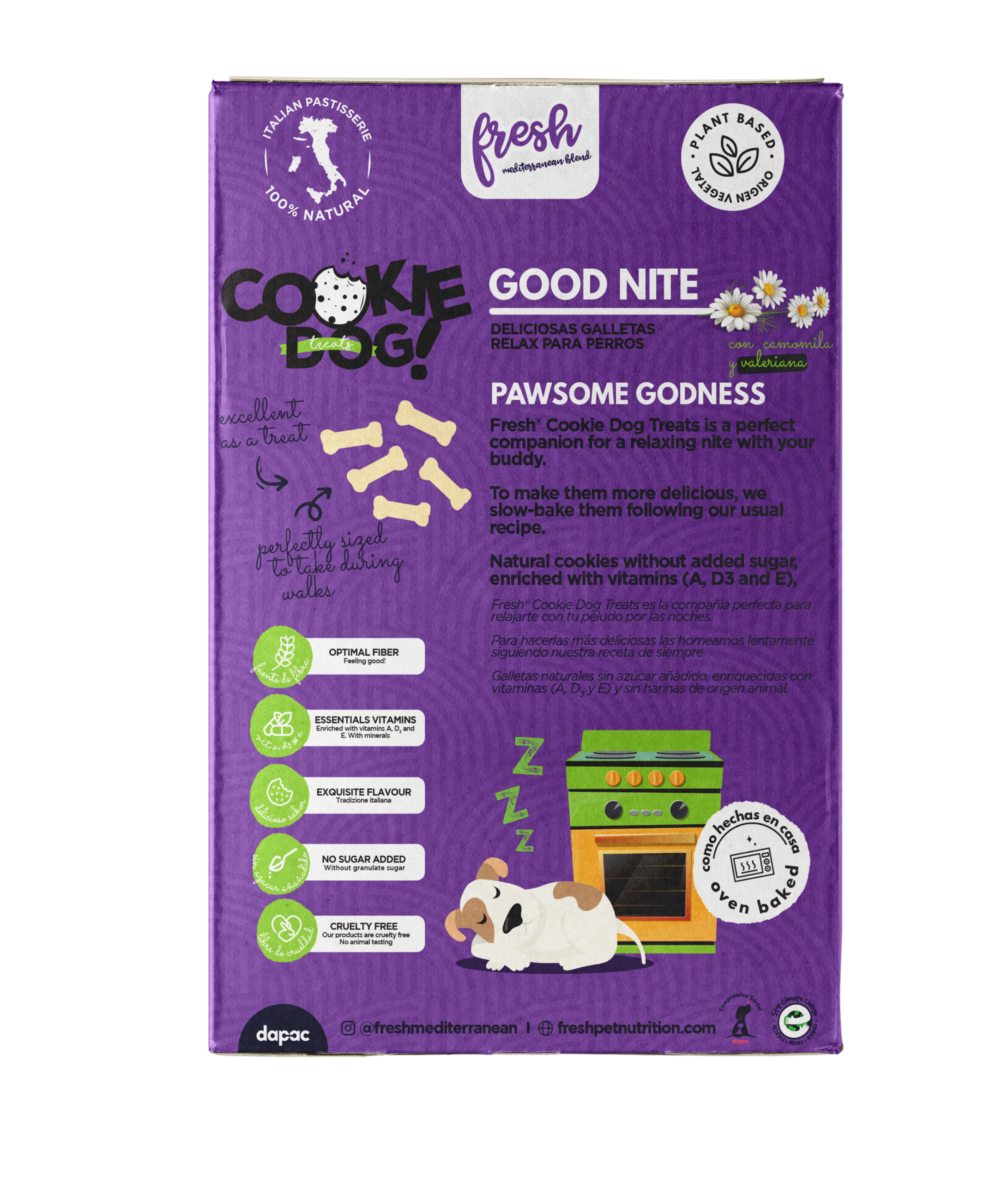 Las Fresh Cookie Dog Treats Good Nite son unas deliciosas galletas para perros adultos de cualquier raza. Están elaboradas con ingredientes naturales, 100% vegetales y contienen camomila y valeriana. Ambas plantas poseen propiedades relajantes y sedantes, por lo que son perfectas para que tu perro concilie el sueño o se relaje antes de dormir.