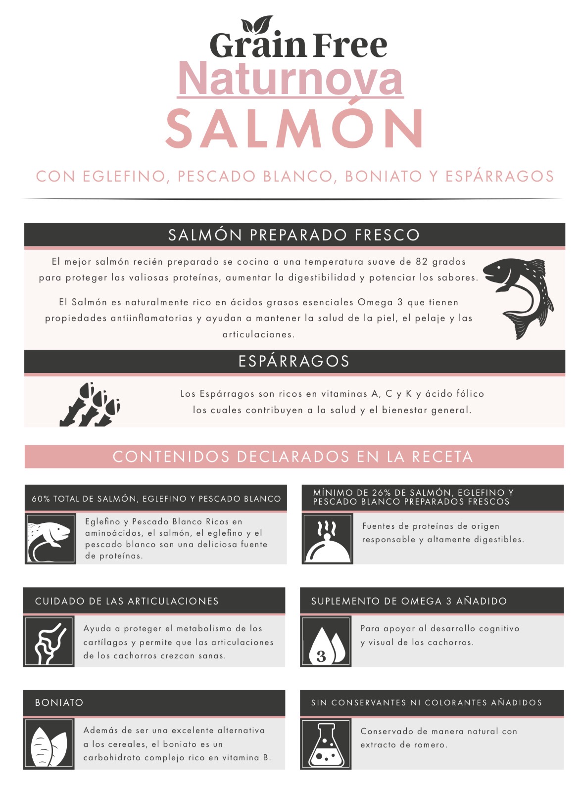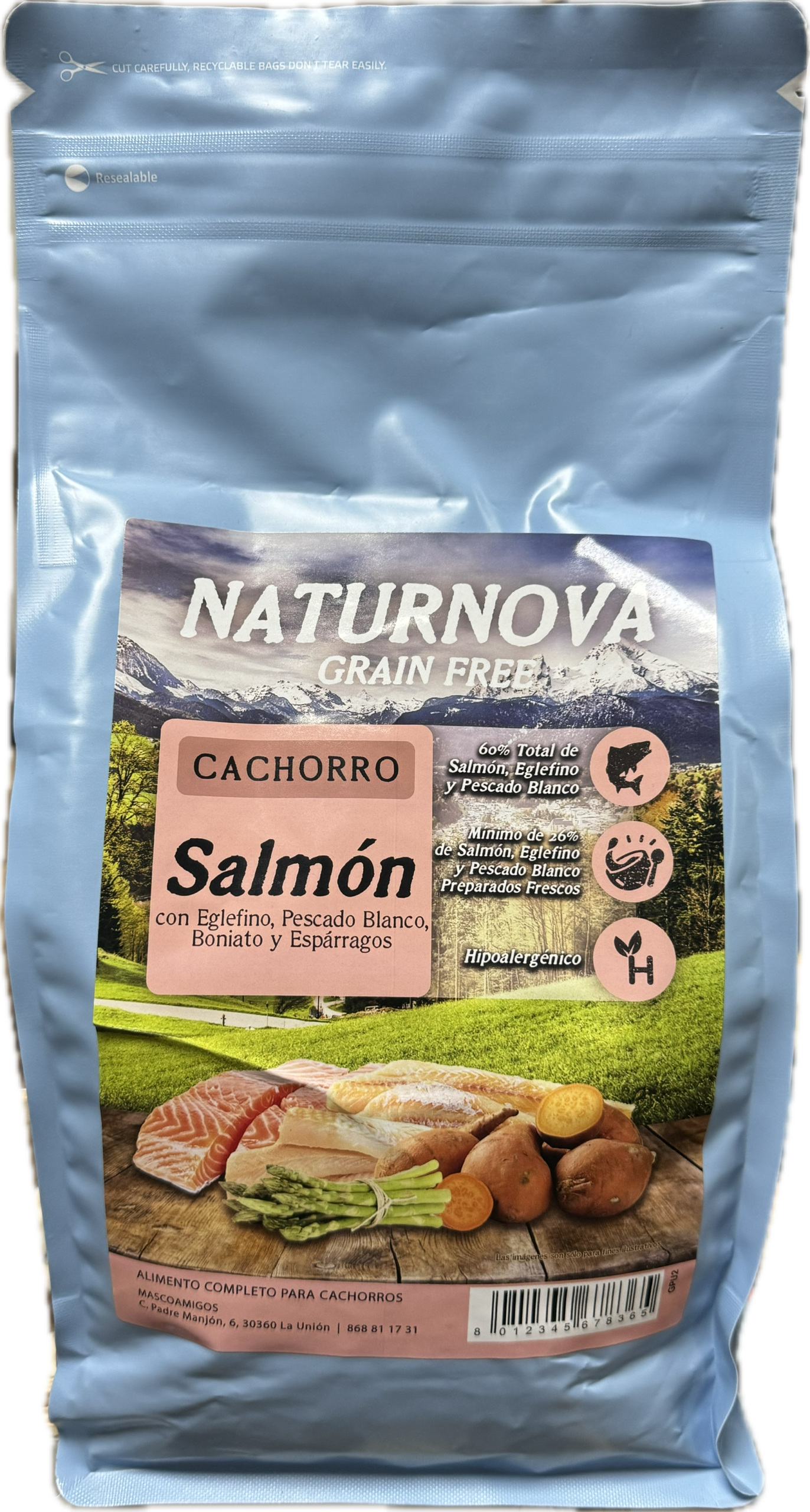 Naturnova Grain Free Cachorro Salmón, Eglefino y Pescado Blanco con Boniato y Espárragos.