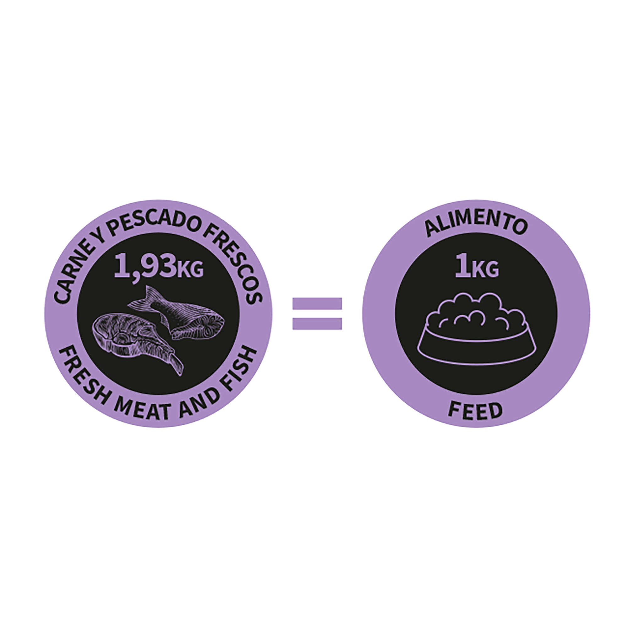 Composición: 30% pollo fresco, 26% cerdo fresco, 22% pescado fresco (alacha (Sardinella aurita), caballa (Scomber scombrus), jurel (Trachurus spp.), sardina (Sardina pilchardus)), almidón hidrolizado, tocoferoles de aceites vegetales, extracto de romero, huevo deshidratado, aceite esencial de orégano, tomillo, clavo, romero, canela Ceylán. ADITIVOS/kg: Vitamina A (3a672a): 22.726 UI, vitamina D3 (3a671): 1.450 UI, vitamina E (3a700): 454 UI, zinc (3b603): 100 mg, hierro (3b103): 72 mg, manganeso (3b503): 36 mg, cobre (3b405): 7,2 mg, yodo (3b201): 1,27 mg.