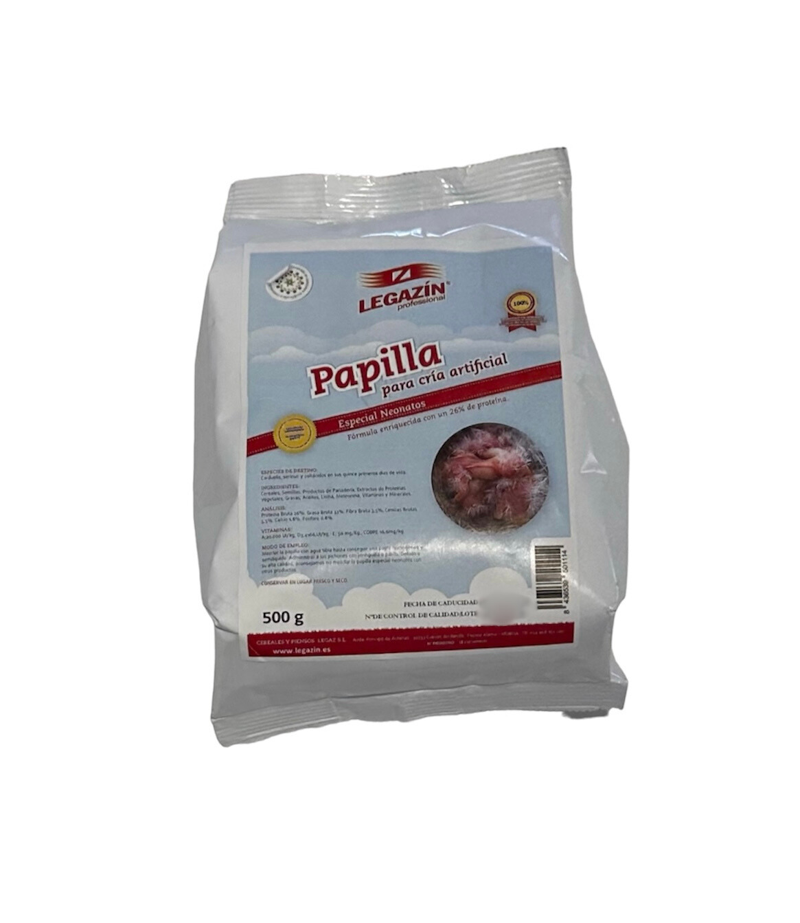 Modo de empleo papilla especial neonatos Legazín: Mezclar la papilla con agua tibia hasta conseguir una pasta homogénea y semilíquida. Administrar a los pichones con jeringuilla o palillo. Debido a su alta calidad, no se aconseja mezclarla con otros productos. No dar nunca fría, ya que perjudicar la salud del pichón.