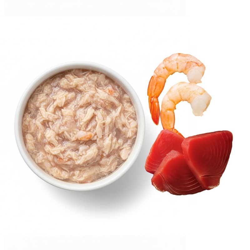 Alimento complementario 100% natural, con auténtico atún y gambas en gelatina suave. Alto en proteína animal, sin cereales ni aditivos. Ideal para gatos esterilizados.