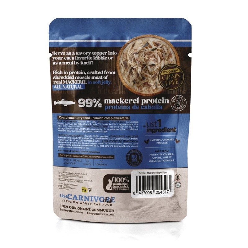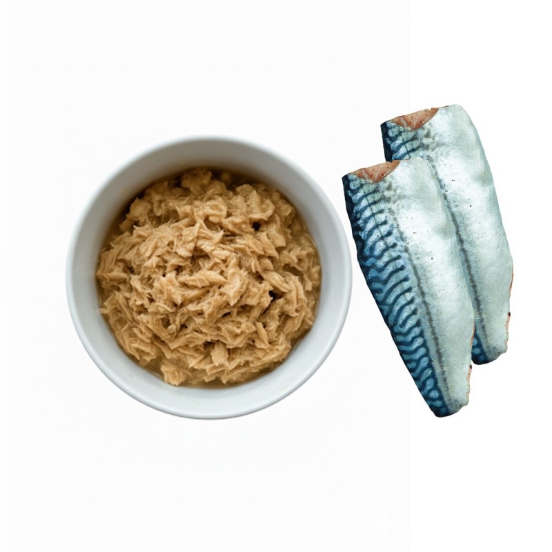 Delicioso alimento complementario de alta palatabilidad con 99% proteína animal, sin cereales y con caballa como único ingrediente principal. Ideal para gatos adultos y gatitos.