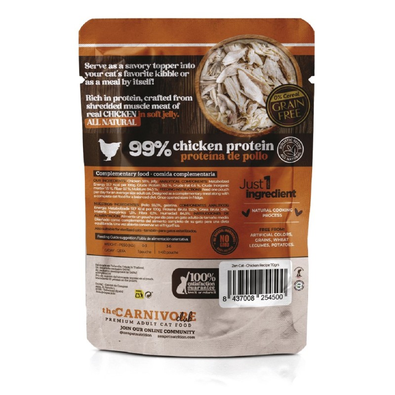 Delicioso alimento complementario premium con 99% proteína animal y un solo ingrediente principal: pollo. Ideal para gatos esterilizados y dietas naturales sin cereales.